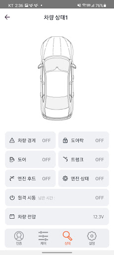 – 실시간으로 차량의 경계상태, 문 열림/잠김 상태, 트렁크 열림/닫힘 상태, 차량의 배터리 전압 등의 정보를 확인할 수 있습니다.