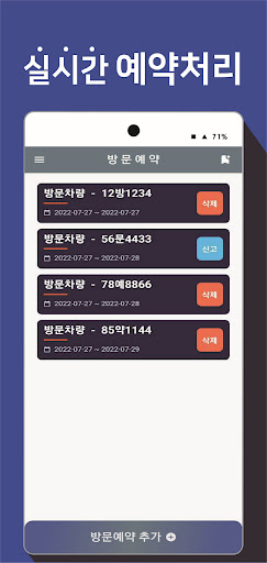 우리단지 방문예약앱은 공동주택에서 세대차량외 방문차량에 대해 출입을 예약하고 조회하는 기능을 수행합니다.