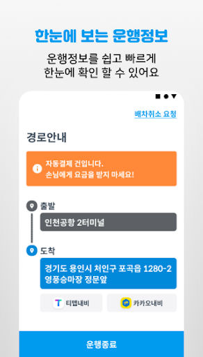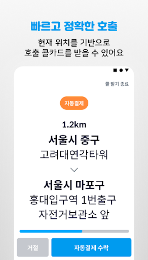 가까운 곳의 호출 콜을 수신할 수 있습니다. 콜카드에서 출발 위치와 목적지를 미리 확인할 수 있습니다.