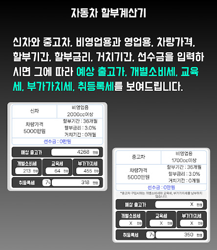 자동차 할부계산과 자동차세 계산을 같이 산출할 수 있도록 하는 어플입니다.
