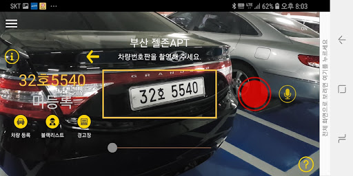 한편, ‘주차단속’앱은 아파트 관리사무소의 연로하신 아저씨들의 주차단속 업무를 지원하기 위하여 ‘음성인식’ 기능과 자동인식(스마트폰 카메라를 번호판 쪽으로 가져가면 자동으로 촬영, 차량번호인식) 기능을 제공합니다. 아저씨들이 카메라촬영버튼을 누르기 힘들거나 손떨림으로 인한 오인식을 방지하기 위함이며, 스냅샷촬영이 곤란한 상황에서는 음성으로 차량번호를 입력할 수 있게 합니다. 물론, ‘음성인식’기능의 경우, 구글의 음성인식기능을 사용하므로 오인식이 발생할 수 있으며, 이때에는 터치하여 직접 수정할 수 있습니다.