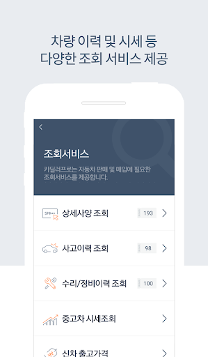 중고차 거래에 필요한 모든 정보를 언제 어디서나 편리하게 조회 할 수 있습니다.