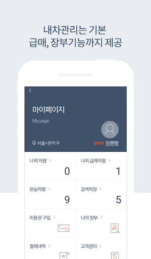 – 차량정보: 차량번호 입력만으로 신차 제원, 중고차시세, 사고이력조회, 수리/정비 이력 등 확인