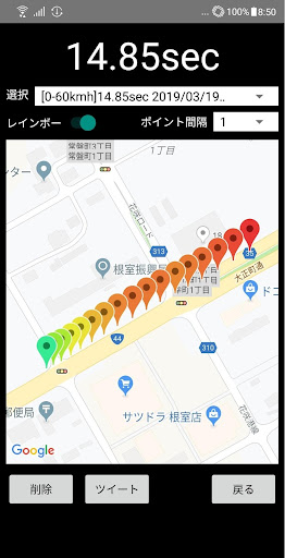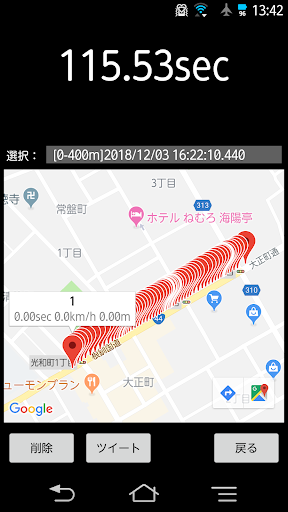 Save results and display time, speed and distance on the map so you can look back later and post to Twitter.