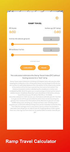 Changing tire size is one of the first mods any 4×4’r does to his/her rig. Did you know larger tires reduces your gear ratio? This means less power, inaccurate speedometer, among other performance hits. The “right” way to add larger tires is to also add lower gears (gear ratio) to counteract the larger tires. This calculator will give you suggestions on what that new gear ratio should be for more torque and better gas mileage. Check out our other calculators too. Ever curious of what your 4×4 articulation ramp score would be, but never had access to a ramp? We have a calculator for that! Among others, give it a download and let me know what you think? –Mark