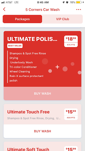 The 5 Corners Car Wash app is a fast and convenient way to purchase a car wash right from your phone! Loyalty points are built right in, so you start earning points for free washes with every purchase. Want to wash your car any day, any time, at any of our locations? Sign up for our Ultimate Soft Touch or Touch Free Pass right in the app for only $79.95 a month!