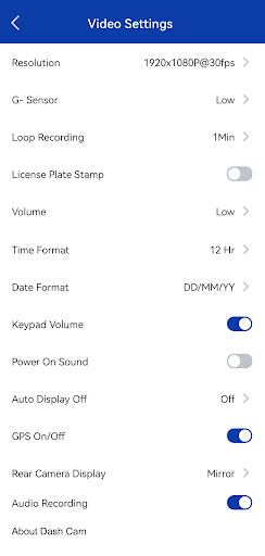 Once connected you can access all the videos recorded by your dashcam stored on the micro SD Card which you can play back on your smartphone . Settings can also be adjusted via the settings menu in the app.