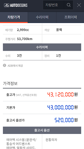 차량번호 입력만으로 출고정보, 신차 제원, 중고차시세, 감가율, 수리/정비 이력 등을 확인 할 수 있습니다.