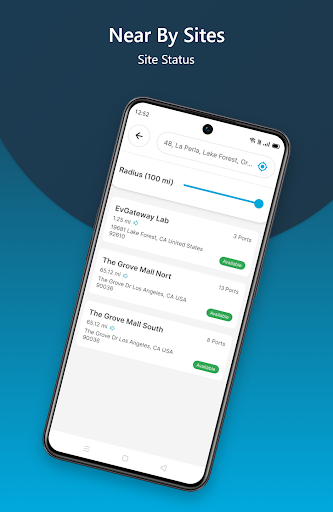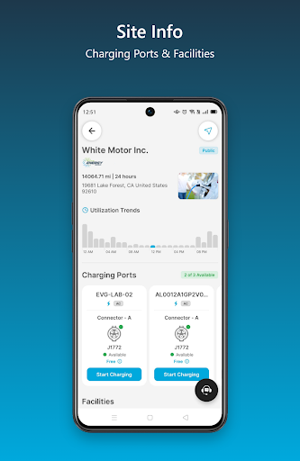 – Details Site Info Screen: You can view detailed information about charging stations, including location, Availability, Amenities, Pricing, Opening times and more.