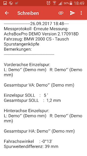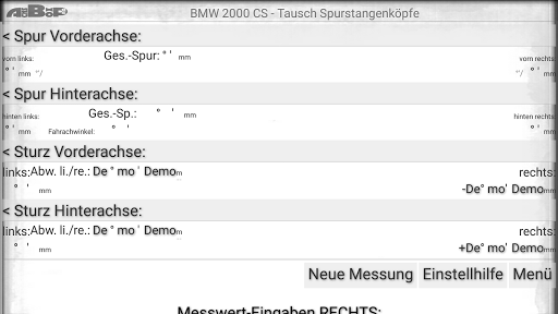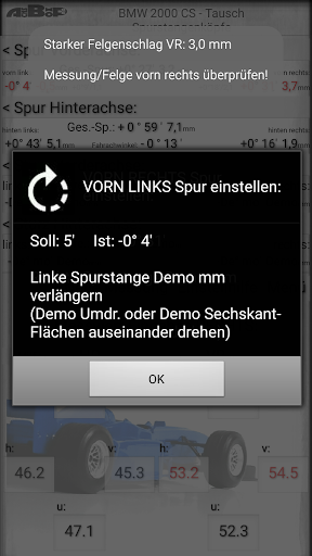 Mit dieser App kann die Spur und der Sturz (nicht in der Demo) an der Vorderachse und Hinterachse festgestellt werden. Eine Felgenschlagkompensation ist möglich.