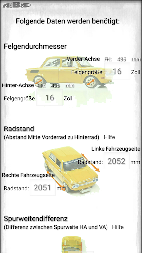 The app was developed for the hobby and motorsport sector and may only be used by people with appropriate knowledge of chassis technology and wheel alignment.