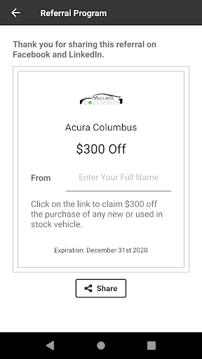 Acura Columbus loyalty app provides customers with an enhanced user experience. The mobile dealership app provide customers with relevant specials and loyalty offers. Key features include: