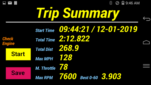 11. The trip summary mode comes with time keeping – you can use it to record lap time by touch SAVE button. You can stop the timing as concluding the trip and SAVE it as well. The best 0-60mph run will be also records here if it’s available.