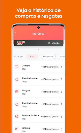 Para consultar o seu histórico de compras e resgates, acesse Extratos. Por lá você pode filtrar por Abastecimento, Compras, Resgates e outros.