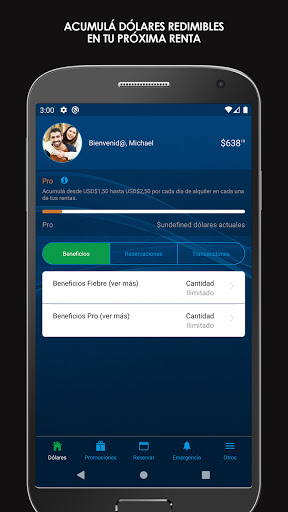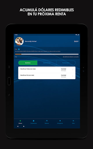Consultar los dólares acumulados, los beneficios disponibles según tu nivel, y las reservaciones y transacciones realizadas por medio del app