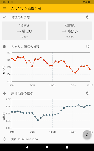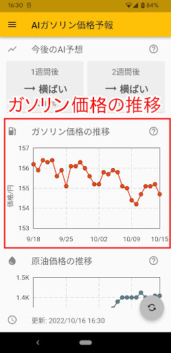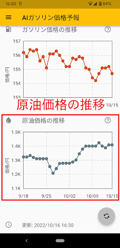 ガソリンは原油から作られるので、ガソリン価格は少し前の原油価格の動向の影響を受ける傾向があります。本アプリは、原油価格のデータをAIで分析することで、高い精度でガソリン価格を予想することが可能です。