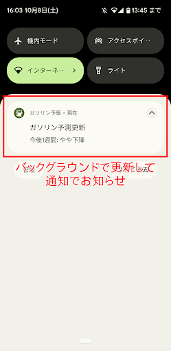 バックグラウンドで定期的に予測を行い、通知してくれる機能もあり、安くなるチャンスを見逃さないようにすることができます。(スマホ再起動後は無効になるため、一度アプリを手動で起動する必要があります。)