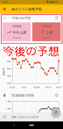 アプリを起動すると、今後1-2週間のガソリン価格の動向を「上昇」、「やや上昇」、「横ばい」、「やや下降」、「下降」の5段階で表示し、予想変化率も%で表示します。