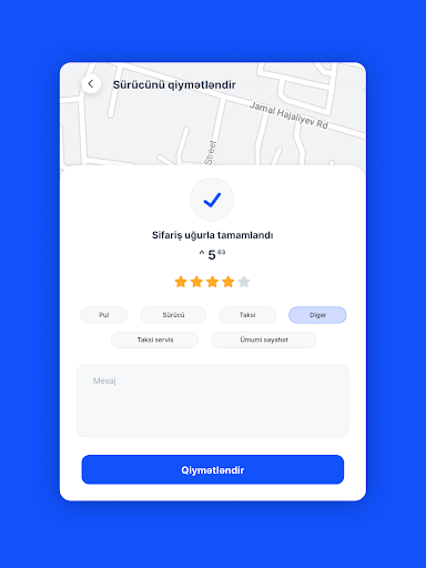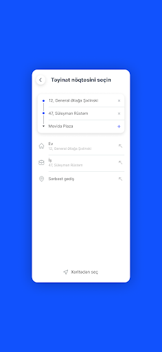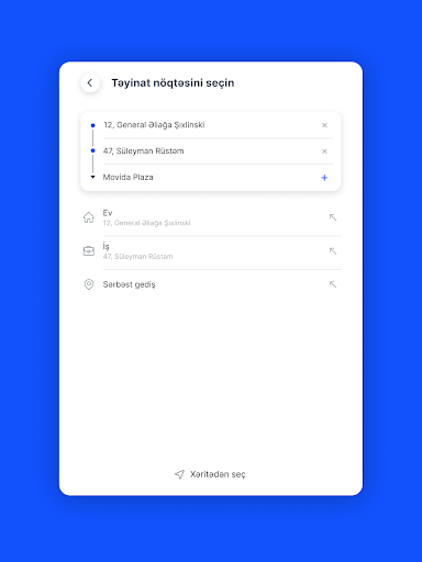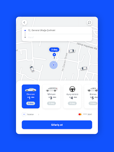 ~ Sistem GPS vasitəsilə Sizin olduğunuz yeri təyin edir. Sadəcə getmək istədiyiniz yeri seçməklə (xəritədə və ya ünvan sətrində) gediş haqqını öncədən öyrənə və istədiyiniz xidməti sifariş edə bilərsiniz.