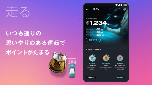 思いやりのある運転や、ミッションをクリアするとポイントがたまります。たまったポイントで素敵な商品が当たるスピードくじに挑戦できます。