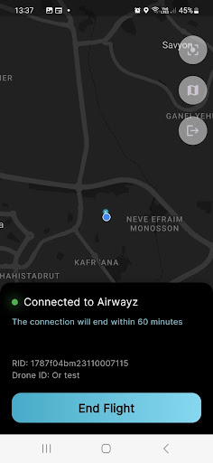 The Airwayz RID app enables you to connect to the Airwayz monitoring and aerial space management platform, fully compliant with the new Israeli drone regulations. Simply purchase the RID transmitter from Airwayz, connect your Airwayz RID app to the RID transmitter, and you’re ready to take flight!