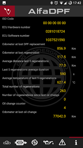 With this app you can monitor DPF (Diesel partuculate filter) status and regeneration, SS functionalities, Turbo, EGR, OIL status, read DTC (Diagnostic Trouble Codes), clear DTC and read some other informations of your engine ECU. The app supports a dashboard functionality to show you, in an elegant way, every day parameters useful during driving. On dashboard is always monitored the DPF regeneration status with a visual feedback during regeneration process.