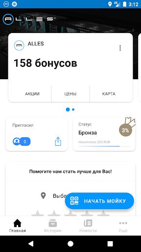 Посмотреть мойки с активной системой «ALLES Bonus» можно в приветственном окне мобильного приложения, раздел «Карта моек».