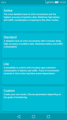 Aplikacija podržava izbor modova iz već postojećeg seta ili kreiranje novog u zavisnosti od specifičnosti potrebe. Veliki broj opcija vam omogućava da primate precizne podatke, a da pritom umanjite potrošnju saobraćaja i potrošnju baterije.