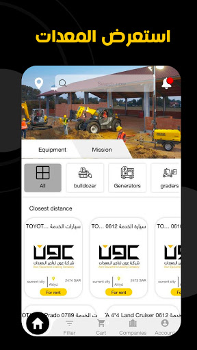 Through this application, we have put a smart solution for you at your fingertips to simplify and easily access the equipment, whether you want to rent or buy it, as the application gives you multiple options for renting and purchasing equipment of various kinds and better control over the searches for the equipment that you need in your tasks