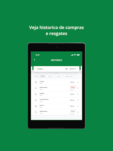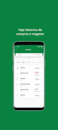 Para consultar o seu histórico de compras e resgates, acesse Extratos. Por lá você pode filtrar por Abastecimento, Compras, Resgates e outros.
