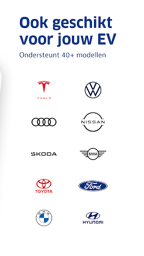 De app is compatibel met de meeste auto’s van de volgende merken: Tesla, Volkswagen, KIA, BMW, Audi, Škoda, Hyundai, Renault, Cupra, Toyota, Mini, Porsche, Seat en Jaguar. Raadpleeg de veelgestelde vragen op onze website voor meer details over welke modellen gekoppeld kunnen worden met de app.