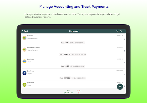 The app accepts Cash, Check, Credit Card, and PayPall payment options. You can collect payments from your clients on the spot.