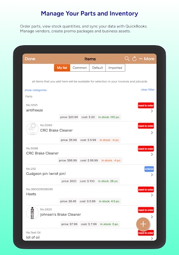 – purchases: create purchase orders for your auto parts. Send the order to your parts suppliers and update your inventory automatically when parts are received.