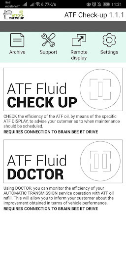 by taking a picture of the new and used oil sight glasses (on ATF station or test tube), ATF Doctor performs an ATF Efficiency Analysis, in order to evaluate the deterioration status of ATF oil and determine whether oil change is needed (requires BT DRIVE by Brain Bee)