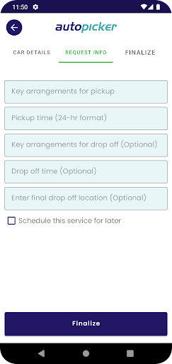 AutoPicker is a service providing app which strictly serves the purpose of getting your vehicle related errands done such as Car Wash, Mechanic etc. All you have to do is enter your car’s location and where you want your car to be washed or checked and one of our drivers will come and take your car while you save your precious time. Moreover, this app also allows you to save the car information while making the service request so that next time, you don’t have to fill out the complete form again. Enjoy using AutoPicker !