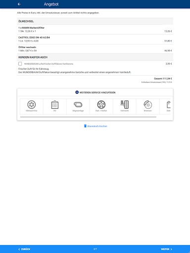 Sie können zudem Zusatzprodukte zu Ihrer gewählten Leistung erwerben und Ihre Präferenz der zu bestellenden Ersatzteile bestimmen. Ihre gebuchten Services können in Ihr Wallet hinzugefügt werden.