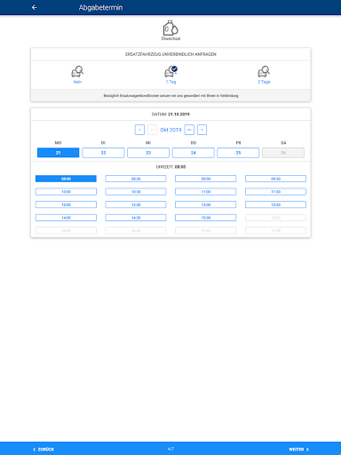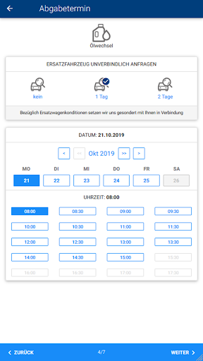 Wählen Sie Ihren Wunschtermin und –Uhrzeit -freie Termine Ihrer gewählten Werkstatt werden Ihnen angezeigt. Übernehmen Sie Ihre gebuchten Termine ganz einfach in Ihren persönlichen Kalender. Zusätzlich kann auch nach Bedarf ein Ersatzfahrzeug gebucht werden.