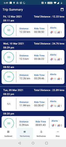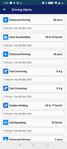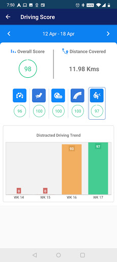 AutoPulse also scores each of the trip on various safe driving parameters and provides a consolidated Safe Driving Score for each trip. These parameters include Over-speeding, Sudden Braking, Sudden Acceleration, Fast Cornering and Distracted Driving. Driving Score trend screen shows the weekly trend of your Safe Driving score and its constituent scores.