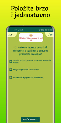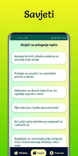 Ova aplikacija sadrži testove koji će vas vrlo kvalitetno pripremiti za ispit iz prometnih propisa. Što se više ispit približava svjesni ste da se morate dobro pripremiti da bi sve prošlo onako kako ste zamislili. Sa dodatnom vježbom šanse za prolaz su vam sve veće, iz tog razloga je ova aplikacija prava stvar za vas. Vrlo je jednostavna za korištenje i uz nju imate i savjete za polaganje vozačkog ispita te najčešće greške koje polaznici učine na ispitima. Zamislite koliko brzo i jednostavno možete ponoviti gradivo dok ste u pokretu.