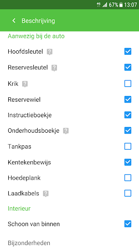 Uiteraard hoort bij een kundig rapport ook de informatie over de aanwezigheid van sleutels, boekjes, accessoires en dergelijke. Deze worden je overzichtelijk gevraagd aan te geven.
