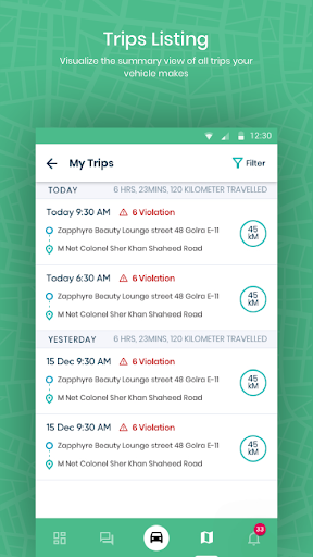 The app will keep a record of the past trips of your vehicle. For every trip, you will be able to view metrics like distance travelled, time duration and violations that occurred.