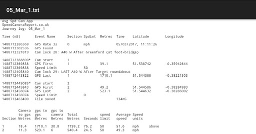 . . . 1: A summary of the sections between average speed cameras including distance, time and average speed.