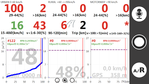 The application provides the driver with a graphical display of the current status for the driver criteria (urban, rural and motorway), such as driven distance, trip shares, test duration, dynamic behaviour and average speed.