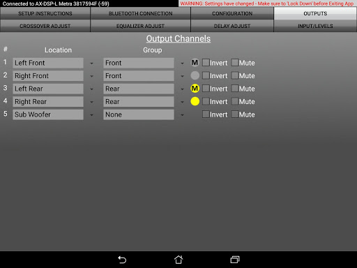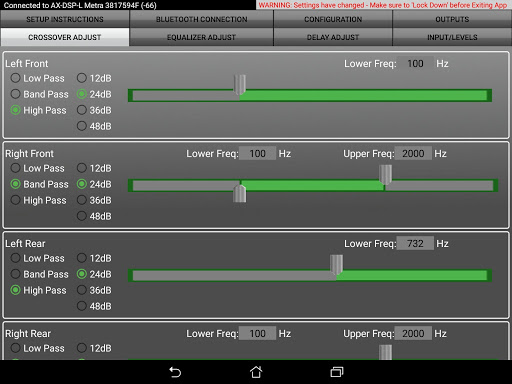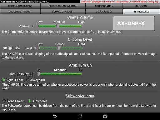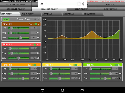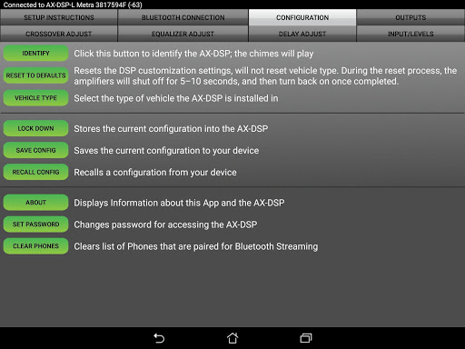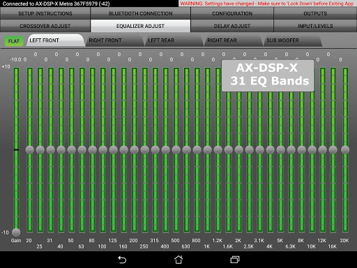 The AX-DSP-XL App allows you to quickly and easily configure all of the parameters of your DSP via the Bluetooth interface on your phone or tablet. Its intuitive interface provides controls for: