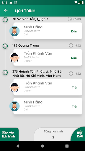 Chức năng quản lý cho tài xế/ nhà xe với ứng dụng Bus2School Driver phân ra 2 cấp: tài xế và nhà xe. Tài xế dễ dàng đi theo lộ trình đã đăng ký trước, có thể mở rộng thêm chức năng cho người trợ lý đón/ trả học sinh để liên hệ với gia đình học sinh hoặc người tiếp nhận học sinh của nhà trường.