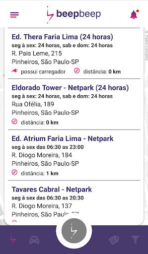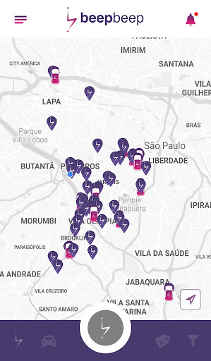 – No app estão sinalizadas as estações de carregamento que são liberadas e o tempo de recarga.