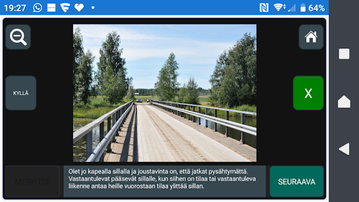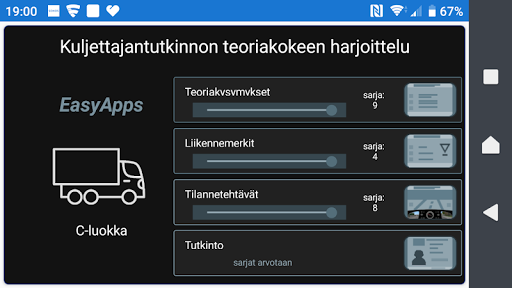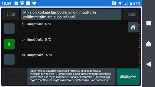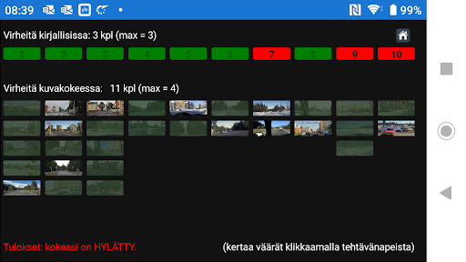 Voit aluksi harjoitella vain teoriakokeen, liikennemerkkien ja kuvakokeen sarjoja. Harjoitteluvaiheessa näet osaamisesi led-palkista, kuvan ympyröistä ja palautetekstistä.