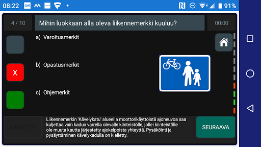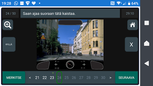 Voit aluksi harjoitella vain teoriakokeen, liikennemerkkien ja kuvakokeen sarjoja. Harjoitteluvaiheessa näet osaamisesi led-palkista, kuvan ympyröistä ja palautetekstistä.