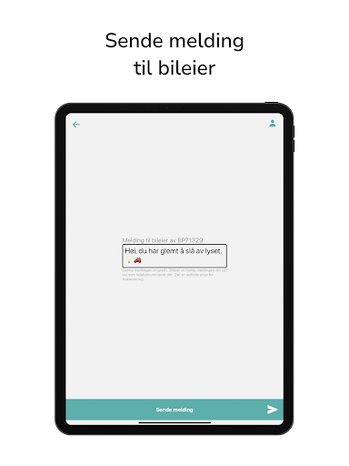 Sende melding til bileier. Det eneste du trenger å vite er registreringsnummer. Dette er gratis funksjon.