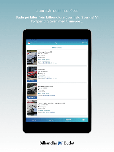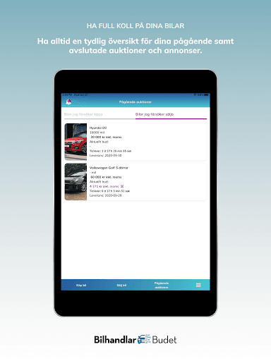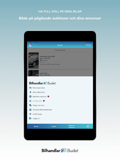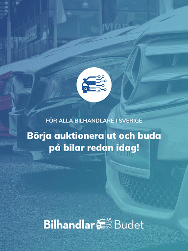 Det är alltid gratis att sälja i Bilhandlarbudet. Bilhandlarbudet är till för att förmedla affärer mellan bilhandlare och företag. Vid vunnen auktion erbjuds transportlösningar inom hela norden med exakta prisuppgifter för leverans till just din firma. Vi erbjuder även en marknadsledande garanti för alla bilar som auktioneras i appen vilket ni enkelt lägger till vid avslutad auktion. Endast godkända handlare och företag har tillgång till Bilhandlarbudet, kontakta oss för ansökan om konto.